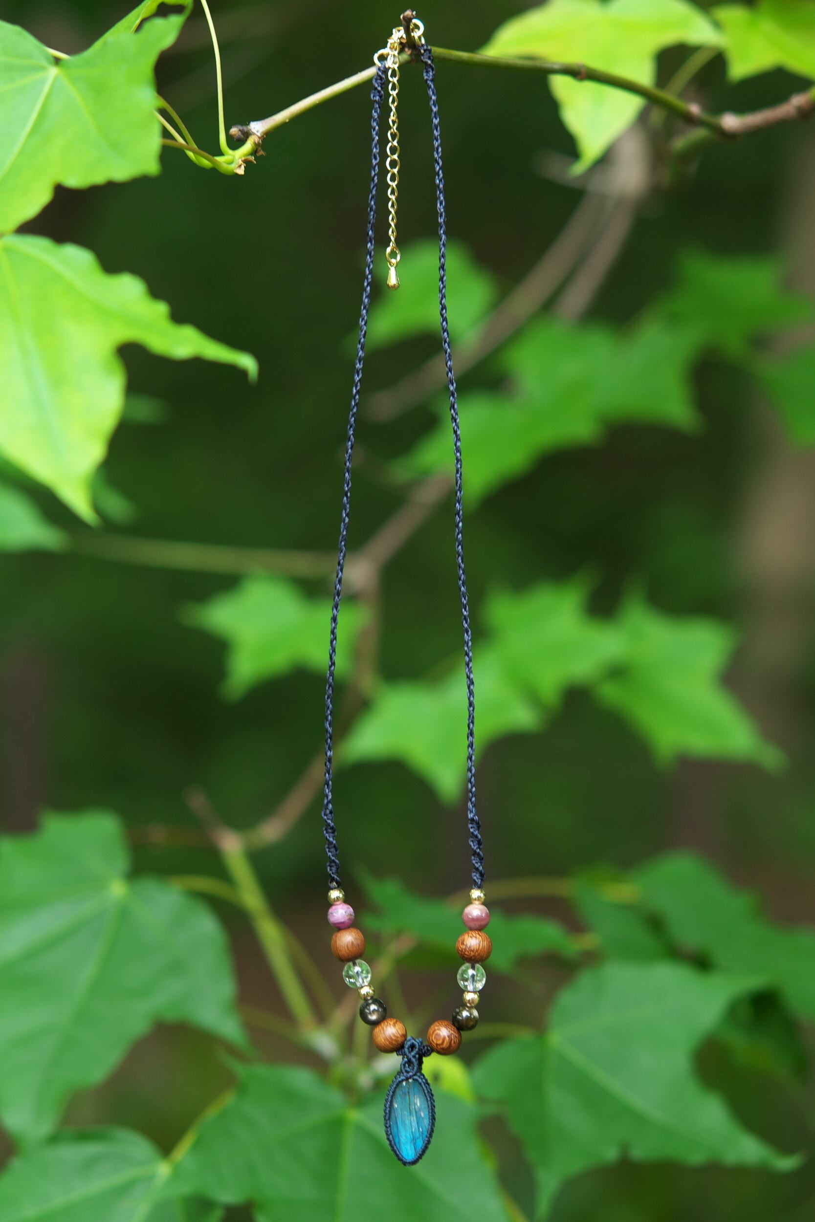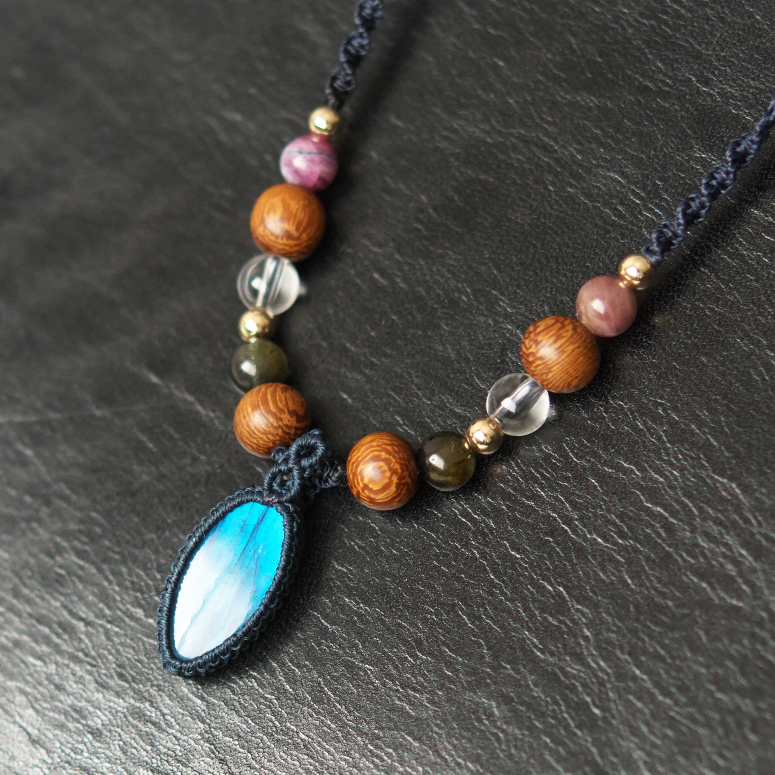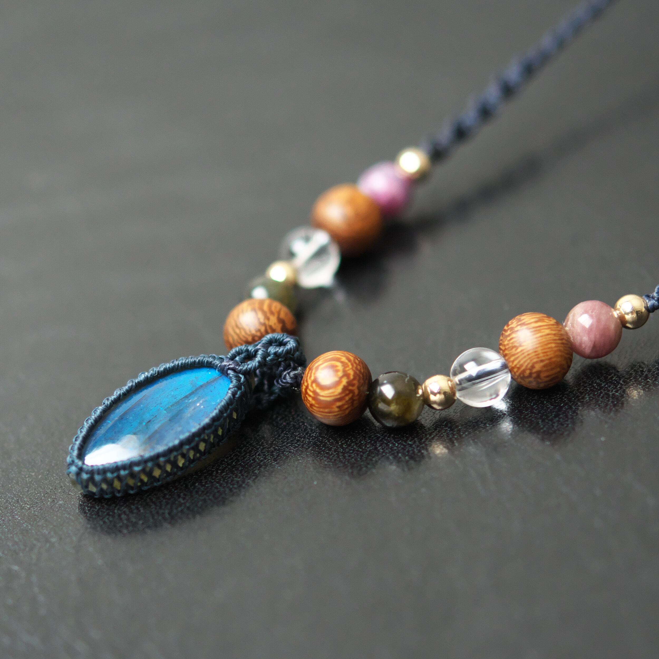 ペンダントトップに用いたラブラドライトには、レザークラフト用の極細コードでフレームを編み込み、繊細な仕上がりです。