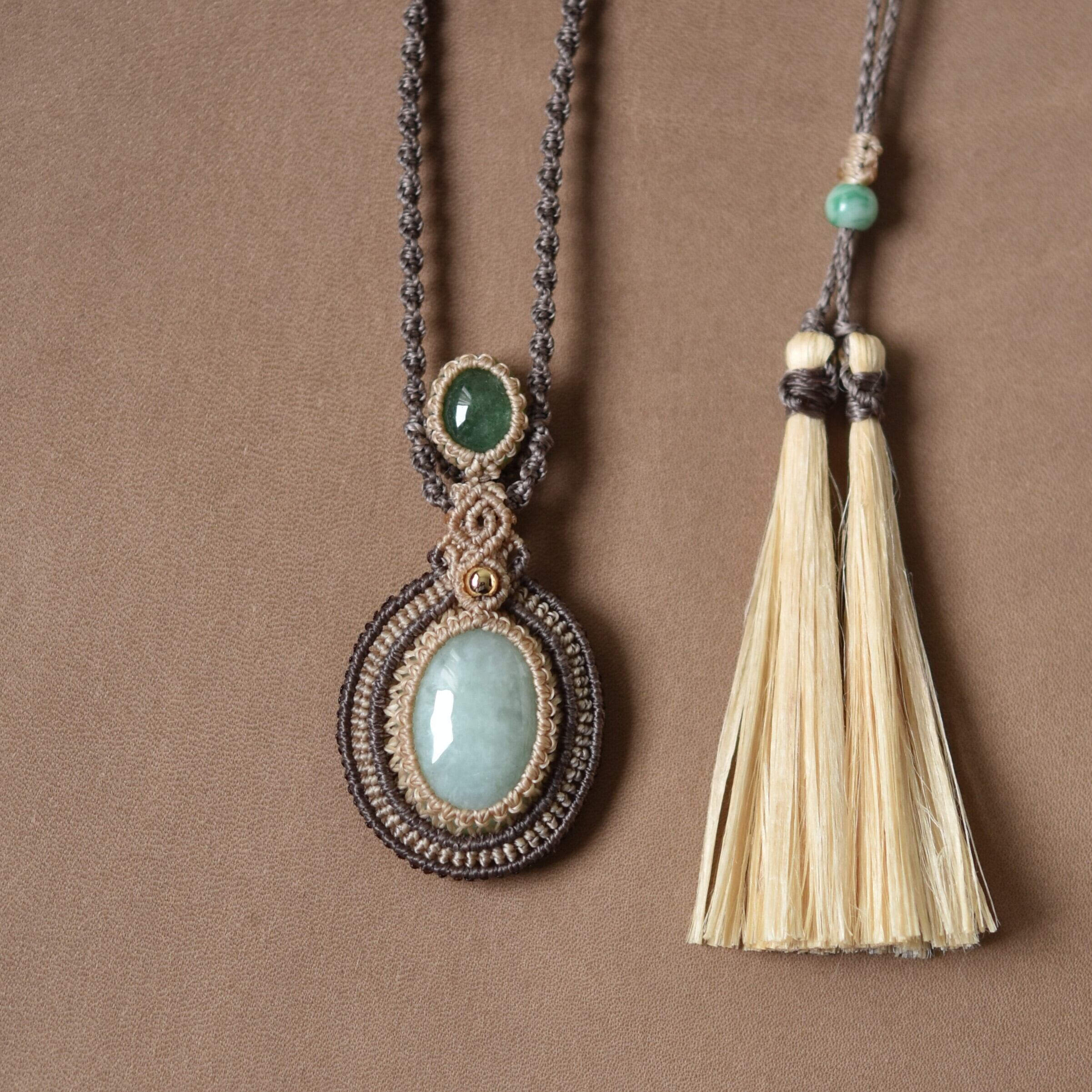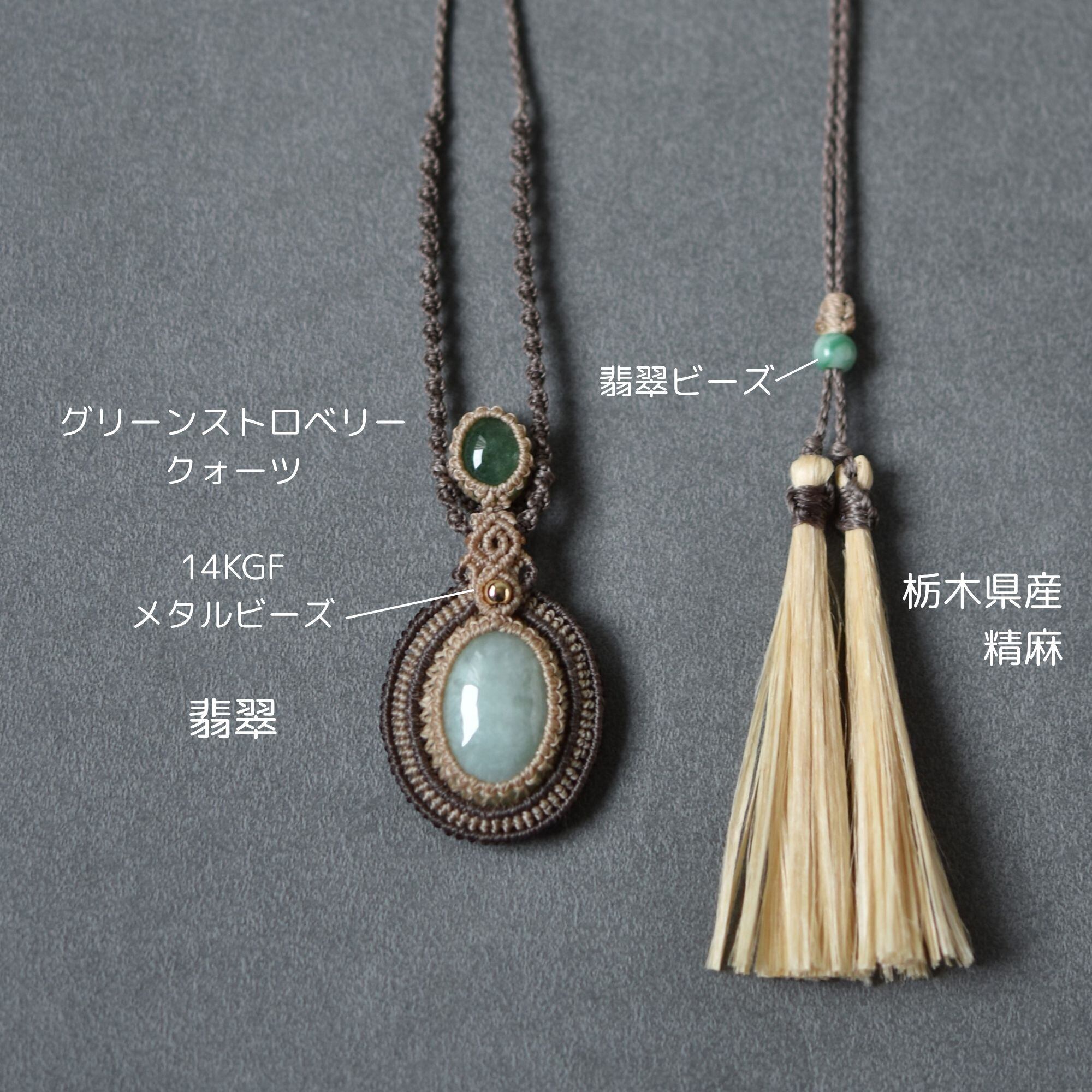 ビルマ翡翠と精麻、グリーンストロベリークォーツを組み合わせたマクラメネックレスです。