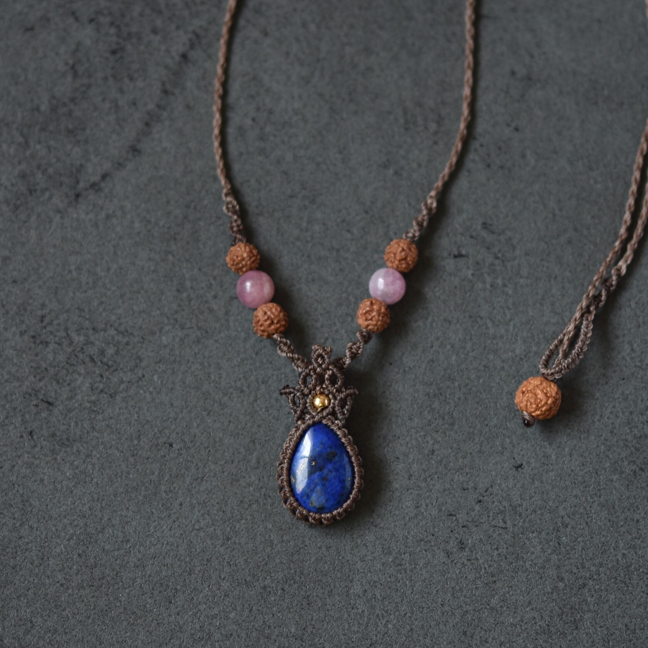 こちらのネックレスはラピスラズリを0.35mmのワックスコードで丁寧にマクラメ編みし、
