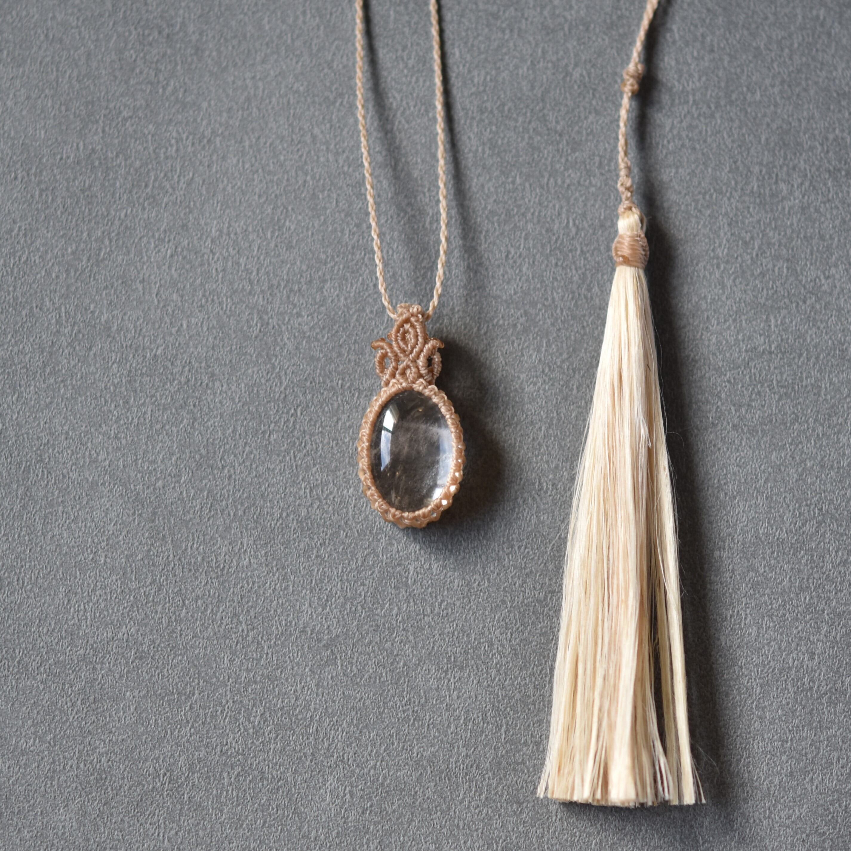 ミスト入りでぷっくりとしたヒマラヤ水晶と、栃木県産精麻をあわせたマクラメネックレスです。