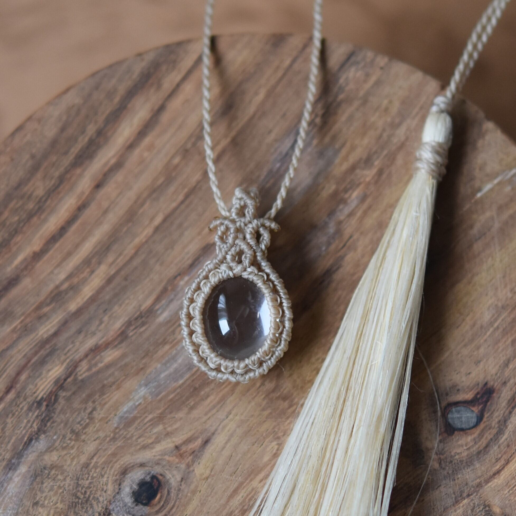そのやわらかな質感に合わせるようにして、マクラメ編みでヒマラヤ水晶を包みました。