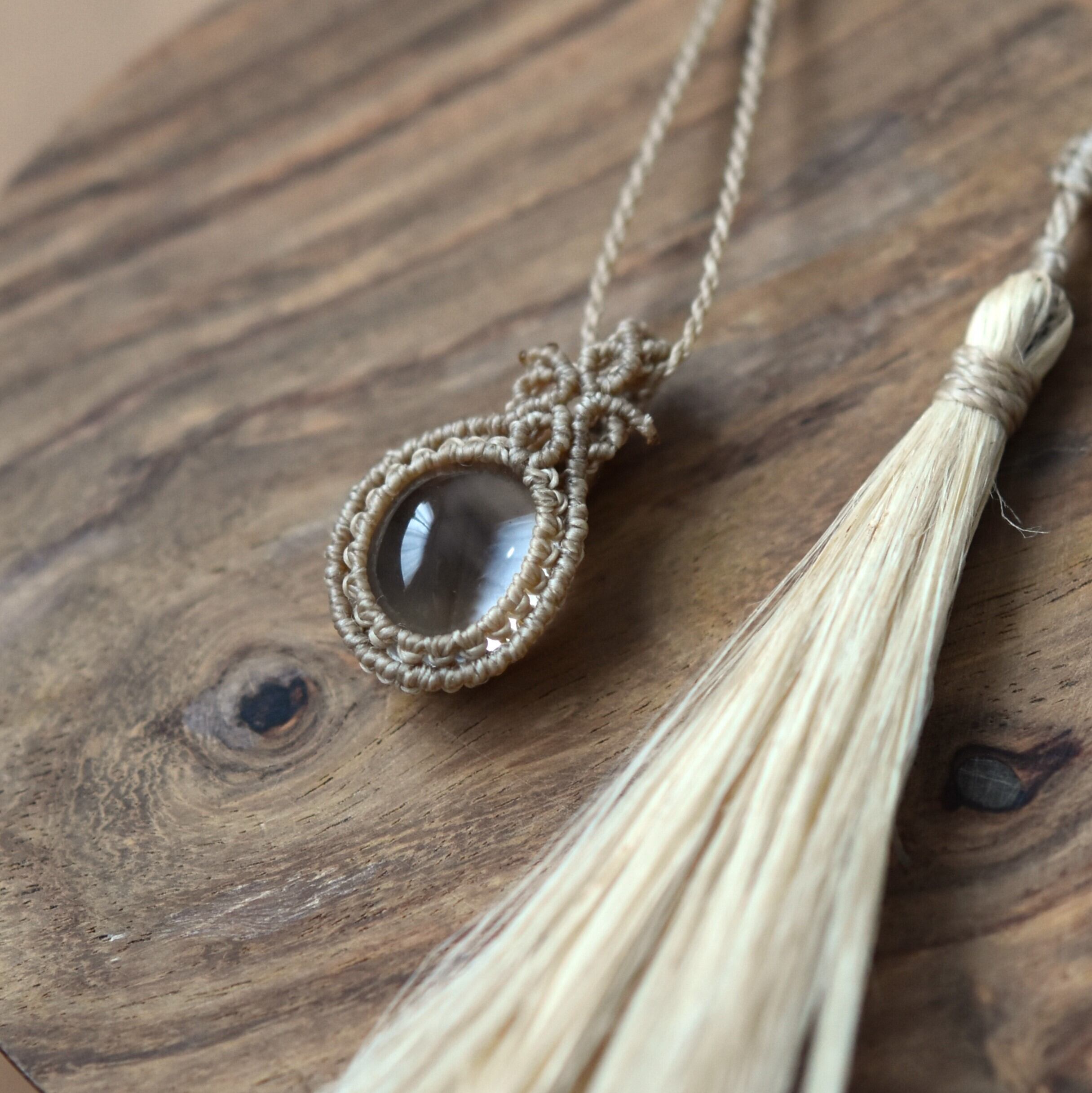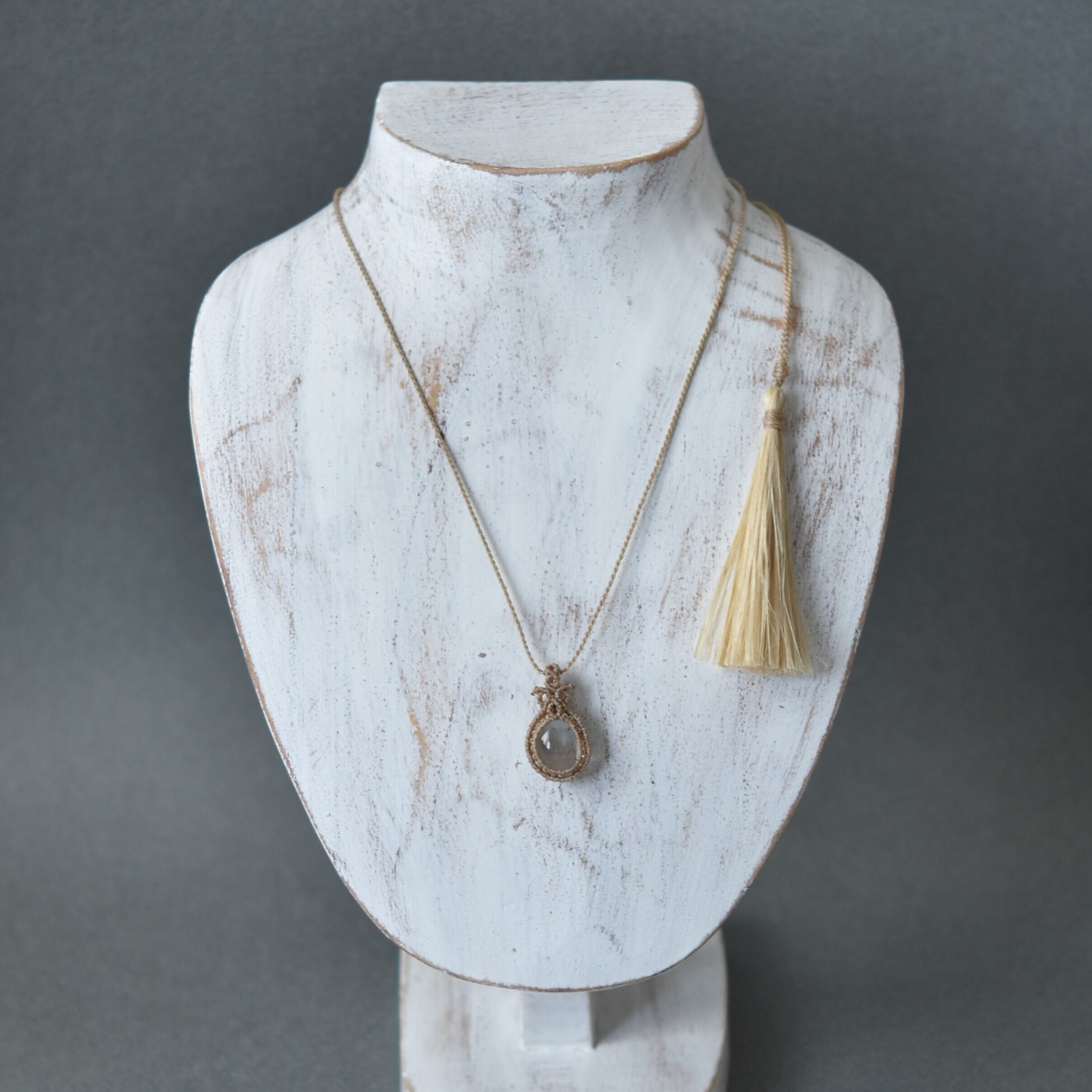そのやわらかな質感に合わせるようにして、マクラメ編みでヒマラヤ水晶を包みました。
