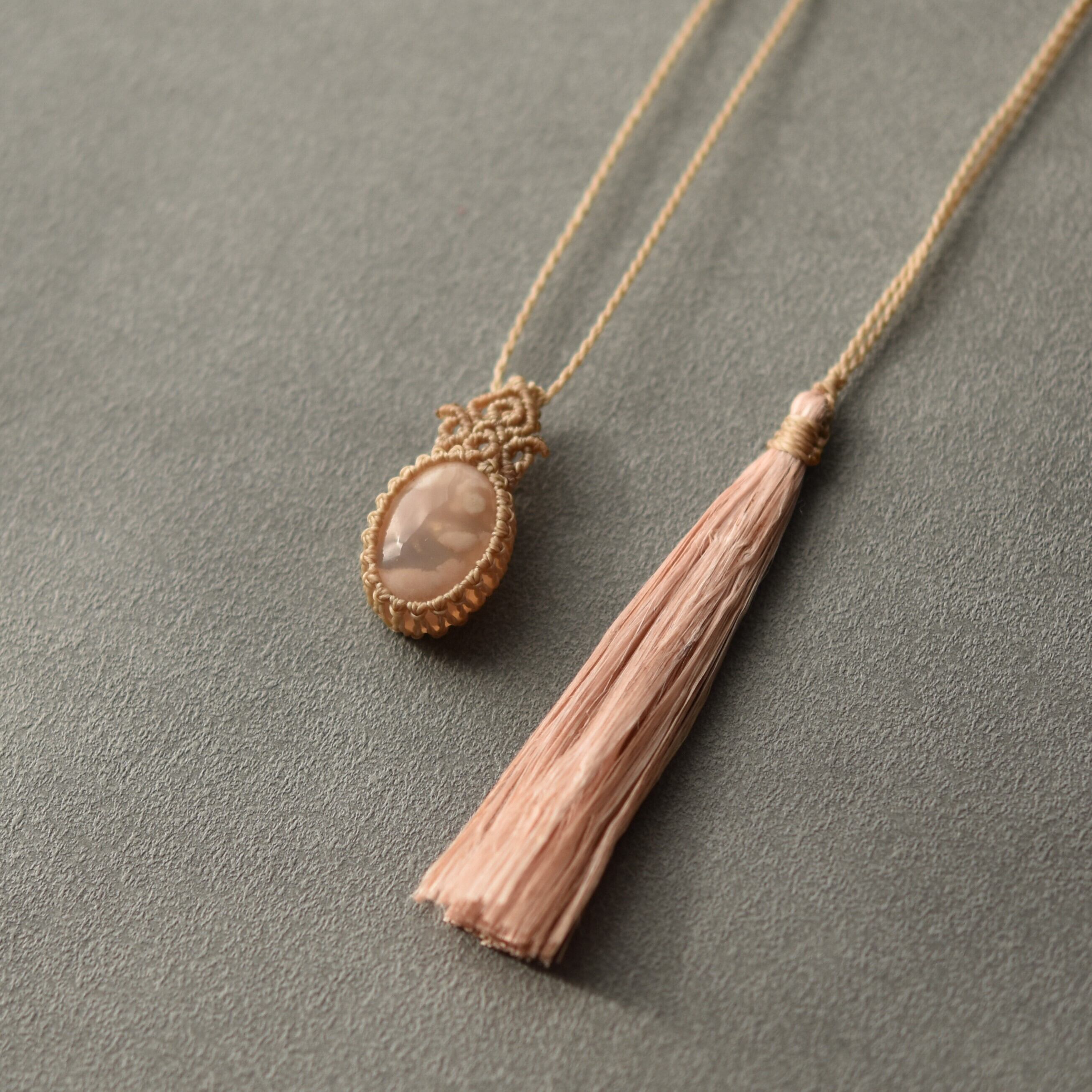 桜めのうをペンダントトップに、苺染め精麻のタッセルを合わせたマクラメネックレスです。