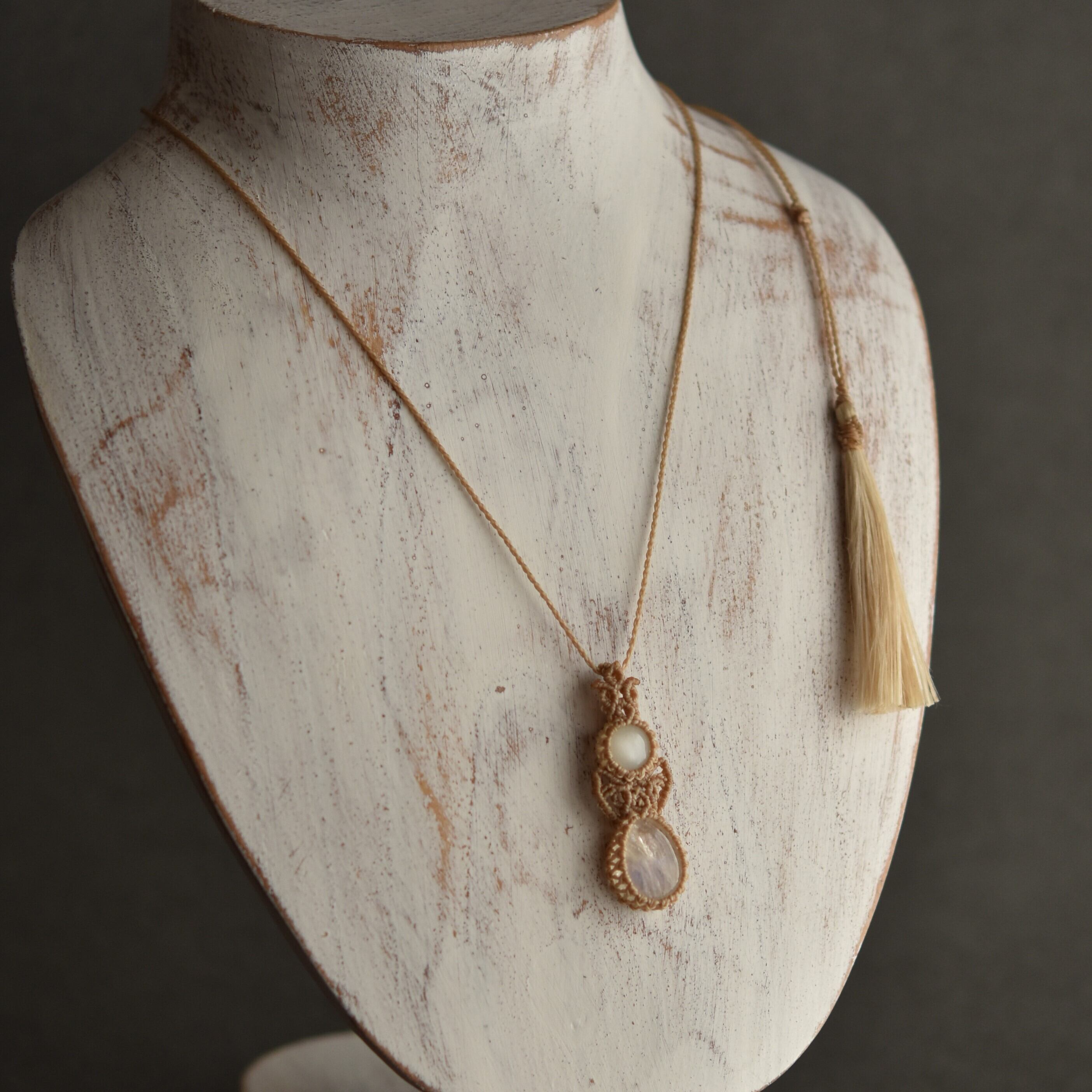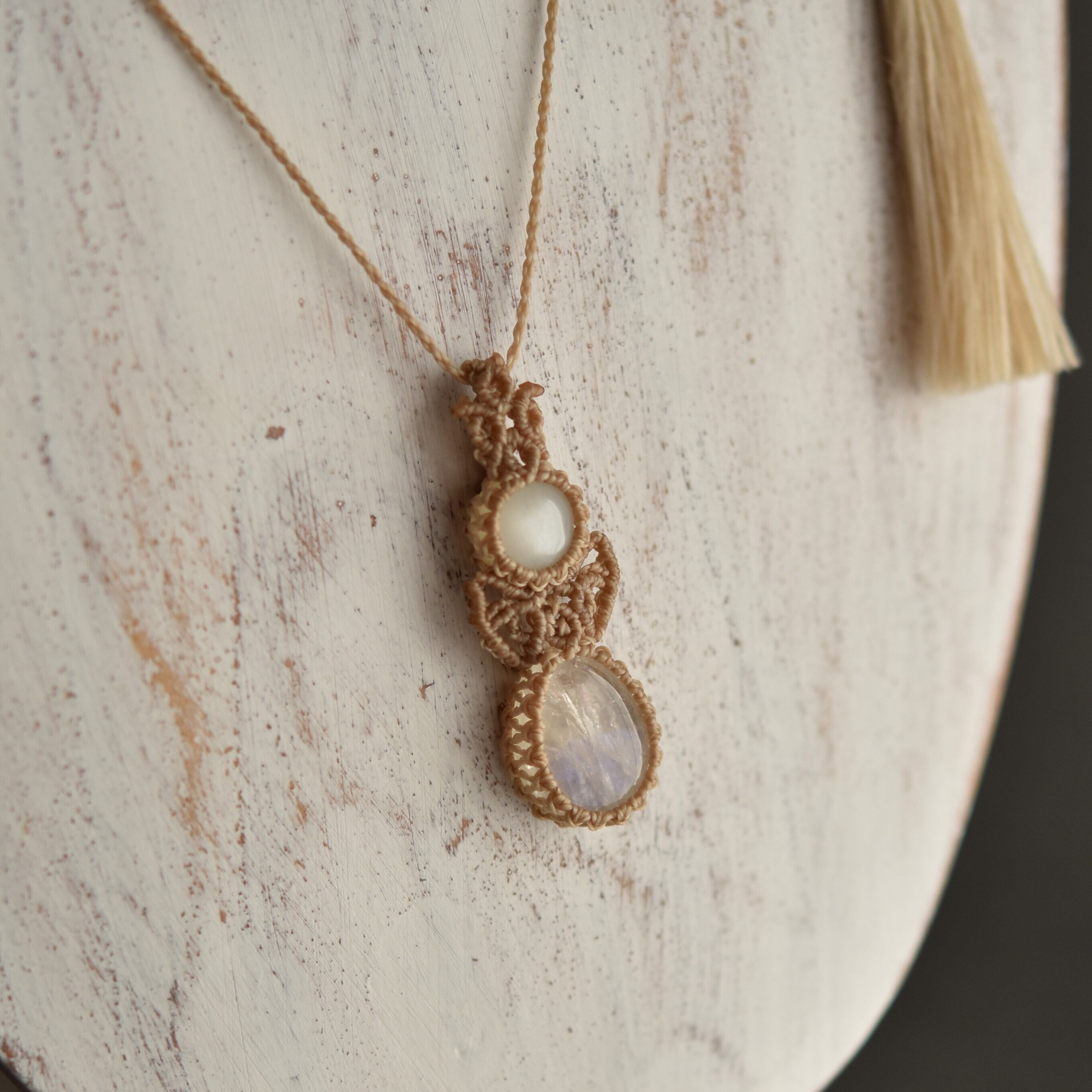 ホワイトムーンストーンとレインボームーンストーンを2石並べ、天使のようなデザインに編み込み、精麻のタッセルを背守りにあしらったマクラメネックレスです。