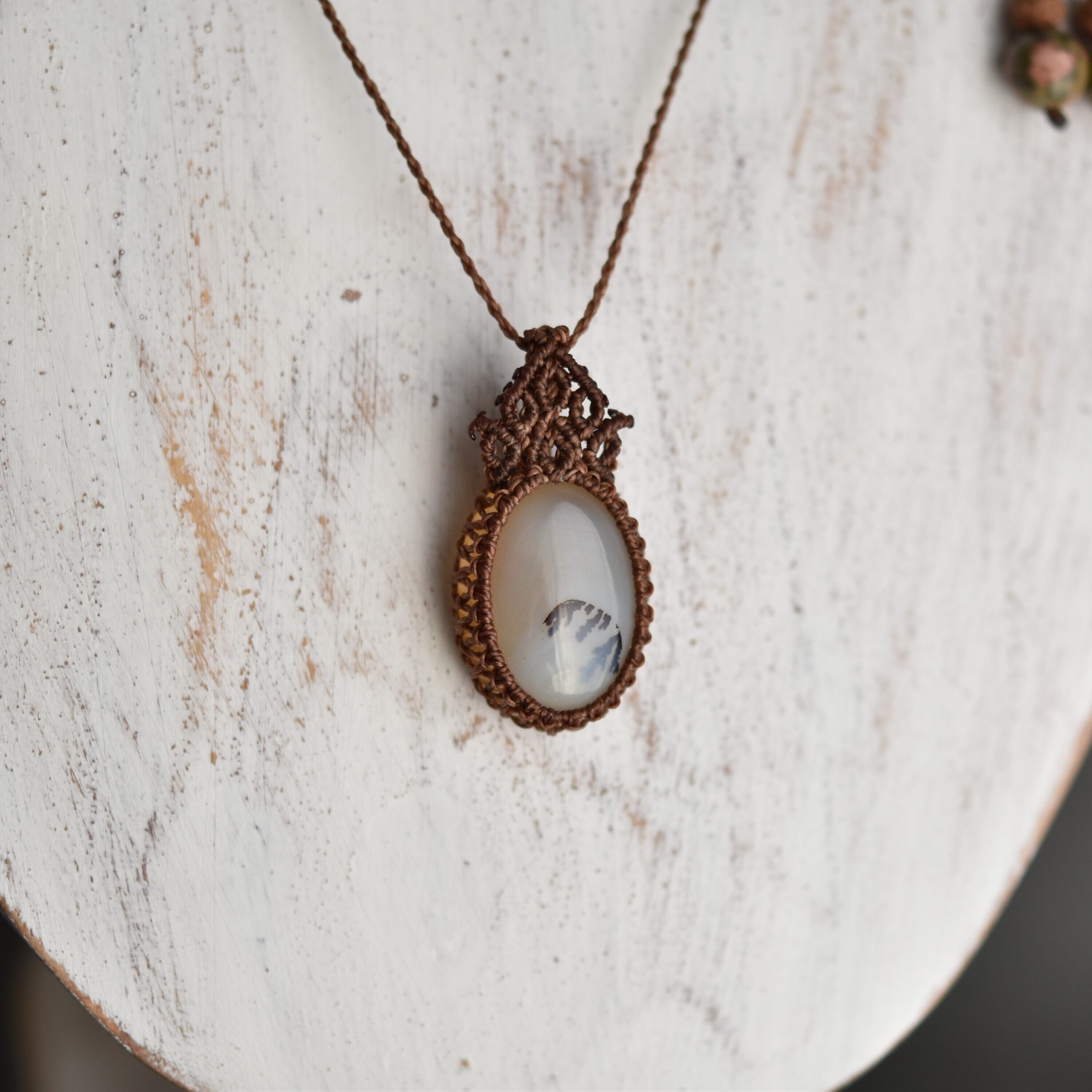 森の中を歩くようなイメージで石包みと模様編みを施し、ルドラクシャと癒しの石・ユナカイトと組み合わせて彩ったマクラメネックレスです。