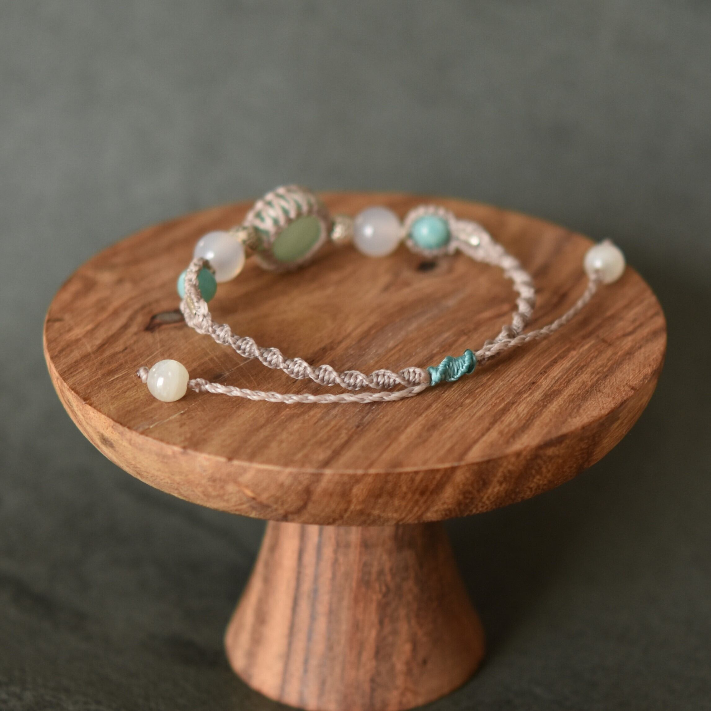 優しい色合いのアップルグリーンカルセドニーを中央に、ホワイトカルセドニー、アマゾナイトなどの天然石ビーズとカレンシルバーで彩ったマクラメ編みのブレスレットです。